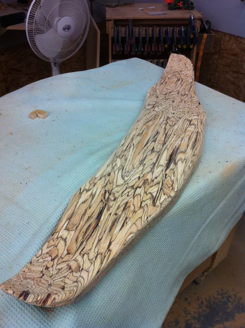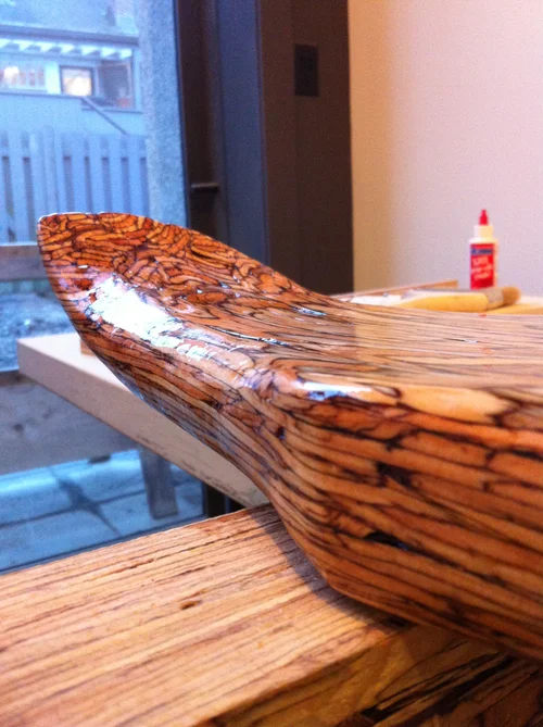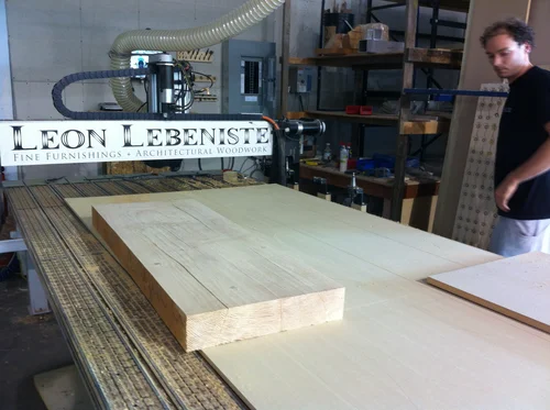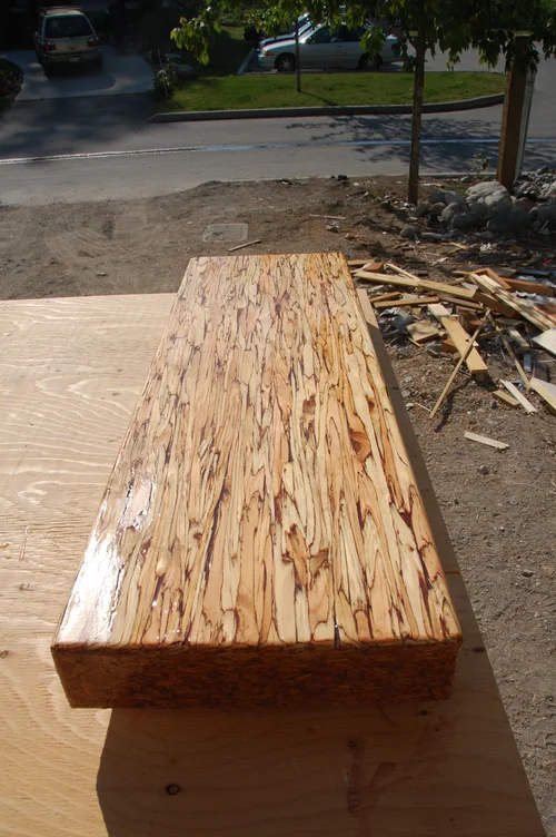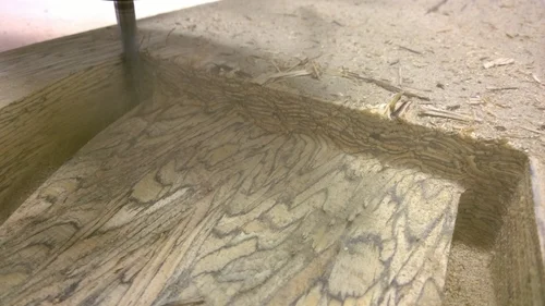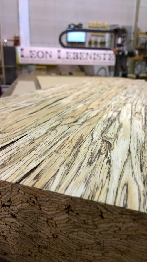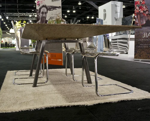 A parallam dining table, designed to exemplify the unique characteristics of the engineered wood, parallam. Sculpted by a CNC router out of four lengths of beam glued together. Created for exhibition at the IDS Vancouver 2014 show.